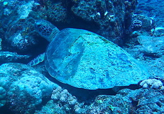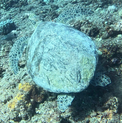 Le 7 juillet 2025, sur le site de Canyon, le jeune tortue verte baptisée Hiruma a été repérée avec "un trou en bas de carapace", signale Kélonia. Cette tortue de La Réunion avait déjà été signalée en janvier 2021 avec la carapace fracturée, victime d'une collision avec un bateau. Alors que le reptile a perdu la mobilité de son train arrière, elle a perdu aussi sa sensibilité et ne réagit pas aux morsures. Ce qui pourrait lui être mortel (Photo : Kélonia)