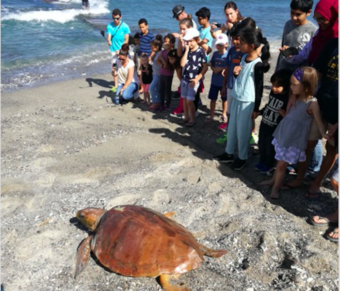 "Les gagnants des Jeux concours des Journées des Tortues Marines 2018, organisées par Kélonia, ont été conviés au relâcher en mer de la tortue Karine.