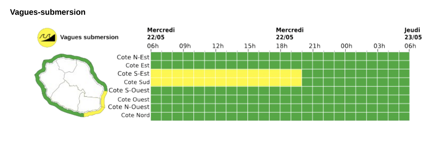 "La mer est forte entre Saint-Pierre et Sainte-Rose en passant par la Pointe de la Table, au déferlement d'une houle d'Est-Sud-Est comprise entre 2 mètres et 2 mètres 50. Ailleurs, elle est agitée."