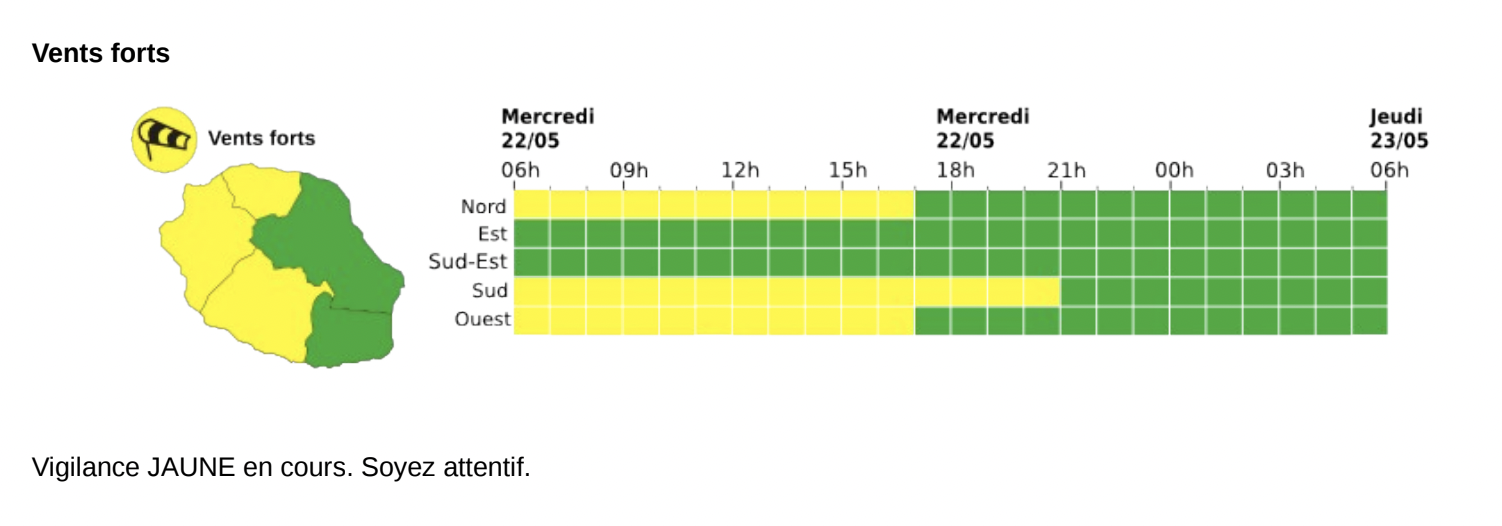 "Le vent reste véloce sur les côtes exposées du Nord-Est et du Sud-Ouest avec encore de fréquentes rafales voisines de 60 km/h. Les brises sont en place de la Pointe des Trois Bassins en remontant vers le chef-lieu."