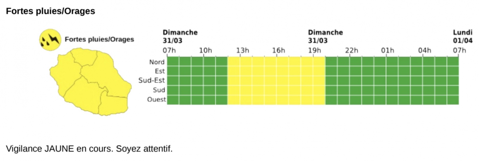 Ce dimanche 31 mars 2024, Météo France a placé tout l'île en vigilance fortes pluies et orages à partir de 12h jusqu'à dans la soirée. Les météorologues annonce que "les averses de l'après-midi se poursuivent sur le sud-est et l'Est du département durant la nuit" (Photo : rb/www.imazpress.com)
