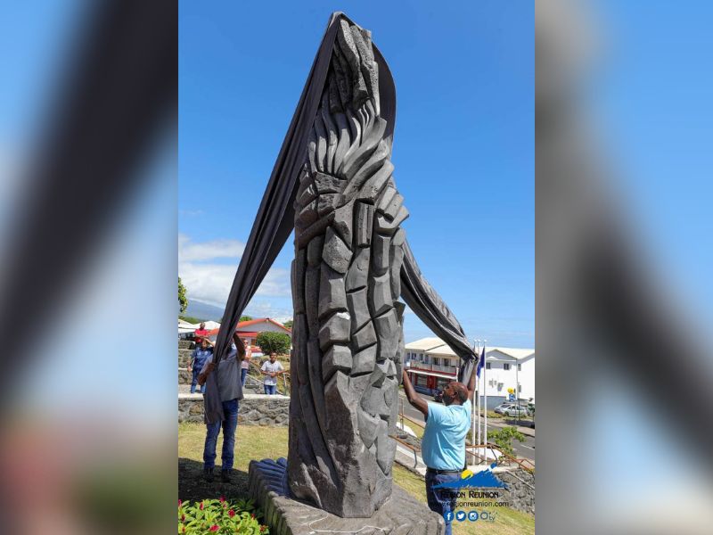 La sculpture “Orgues Basaltiques” a été inaugurée mercredi 15 février 2023 par Huguette Bello, la présidente de la région et Michel Vergoz, le maire de la ville de Sainte-Rose. L'oeuvre de David Imaho symbolise "un volcan en éruption mais aussi un guide et un porteur." (photo : région réunion)
