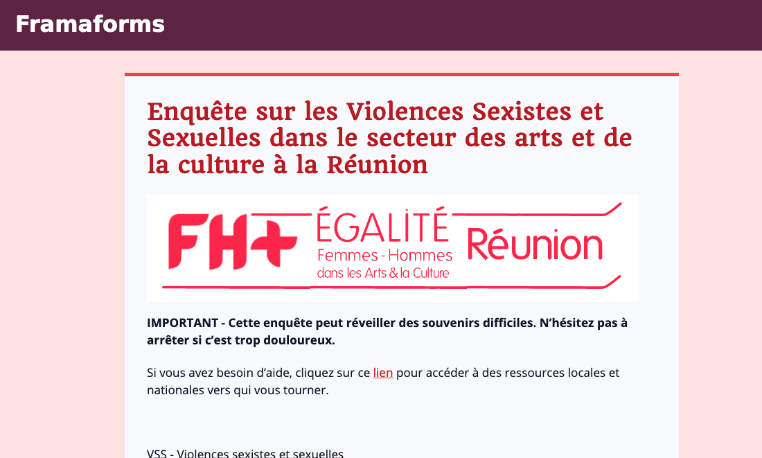 Le Mouvman FH+ Réunion lance une enquête sur les violences sexistes et sexuelles (VSS) dans le secteur des arts et de la culture à la Réunion, du 3 au 24 septembre 2023. "Nos objectifs sont de soutenir les collègues victimes, enquêter et documenter les phénomènes d’inégalités et violences systémiques, lutter contre ces dernières, sensibiliser les professionnel·les, les étudiant·es, les financeurs et le grand public" indique l'association (Capture d'écran / Mouvman FH+)