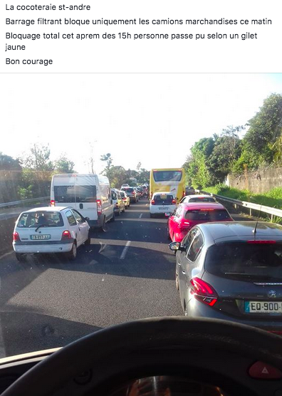 A la Cocoteraie, on signale un premier barrage avec une dizaine de gilets jaunes. Une voie est neutralisée en direction de Saint-Denis. Le barrage est très filtrant mais les bus et les poids-lourds ne passent pas et sont arrêtés sur le côté.