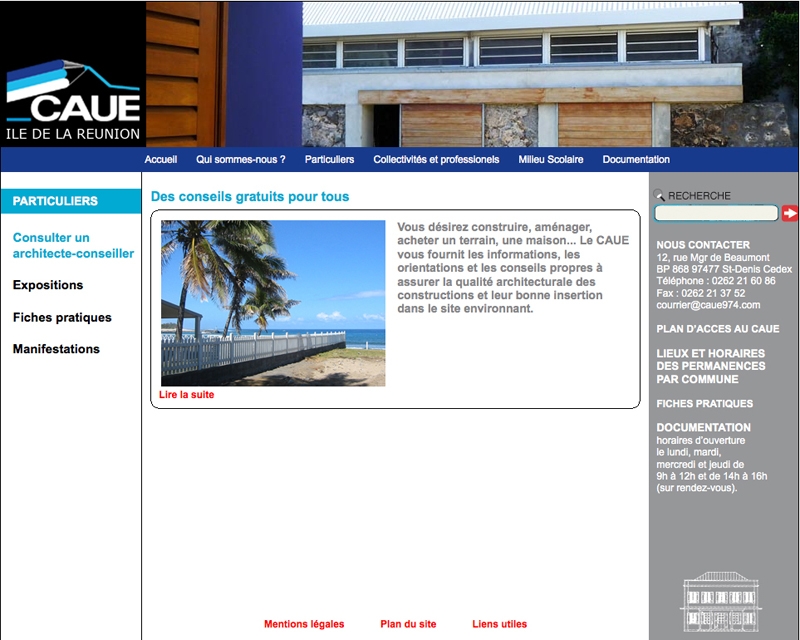 Le site propose également aux élus et professionnels du cadre bâti des renseignements sur les formations " Qualité environnementale " et " Accessibilité " dispensées par la structure. De nombreuses études réalisées par le CAUE pour des collectivités sont également disponibles. Les enseignants peuvent quant à eux consulter en ligne la liste des outils pédagogiques et ouvrages destinés au milieu scolaire et empruntables en centre de documentation du CAUE.Site web : www.caue974.com
