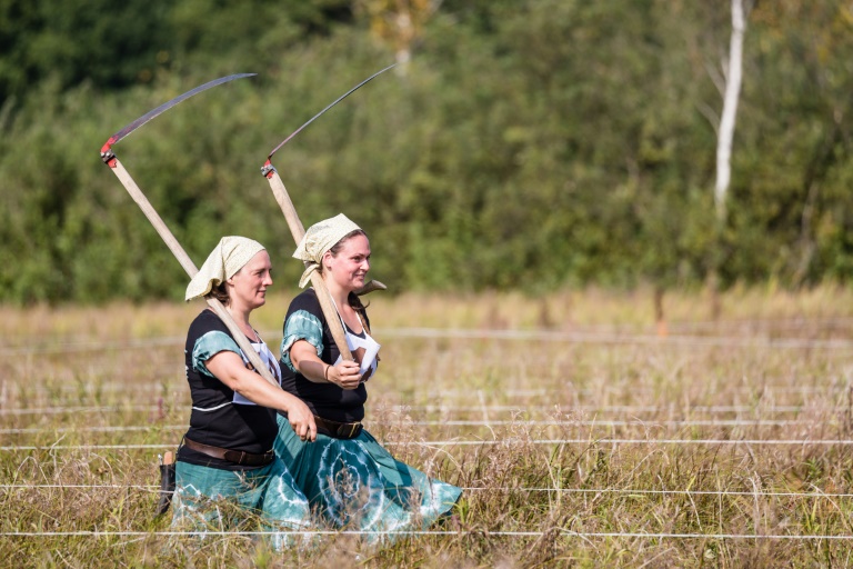 Sept femmes ont aussi tenté l'épreuve. Anna Kasprzak, 42 ans, comptable, est venue avec sa soeur, chef d'exposition au musée du Fort Osowiec. Elles forment un duo, "Les faux aiguës", pour les épreuves en couple. "Avant tout, pour bien faucher, il faut bien aiguiser la faux et comme mon père disait toujours, il faut bien accrocher l'herbe avec la pointe de la faux et bien appuyer par le talon", dit Katarzyna Worona, 49 ans, l'aînée et presque experte pour avoir déjà participé aux Championnat l'an dernier.