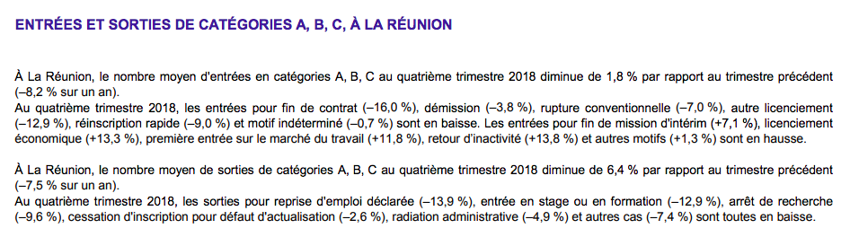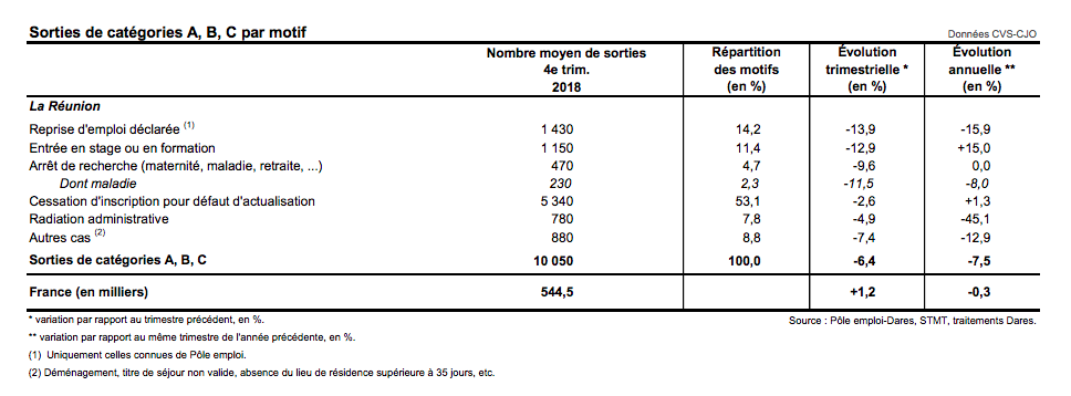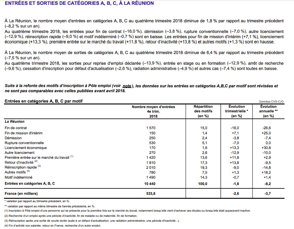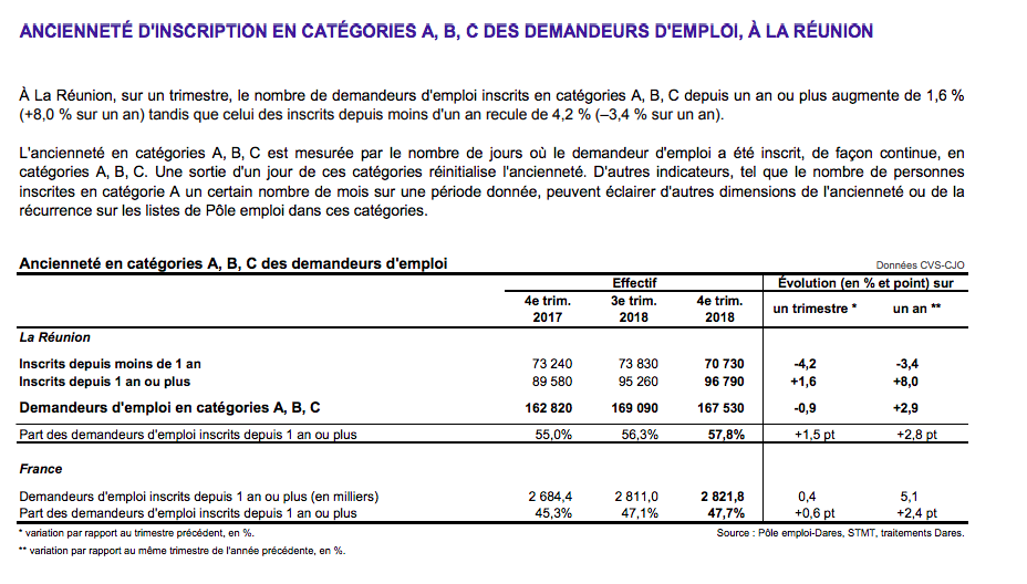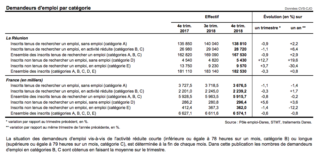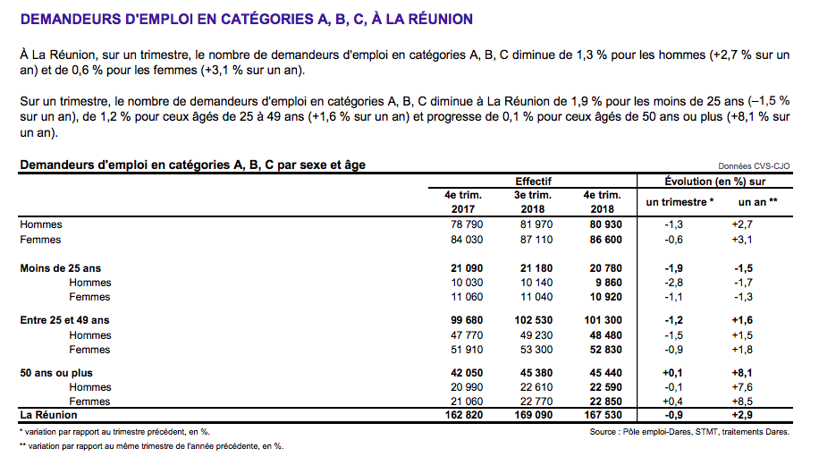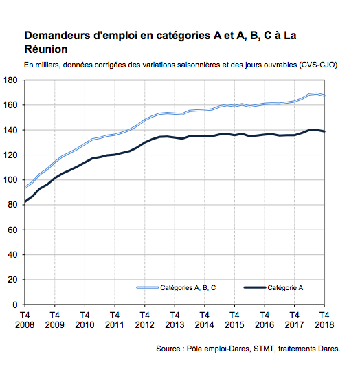 À La Réunion, le nombre de demandeurs d’emploi tenus de rechercher un emploi, ayant ou non exercé une activité (catégories A, B, C) s'établit en moyenne à 167 530 au quatrième trimestre 2018.