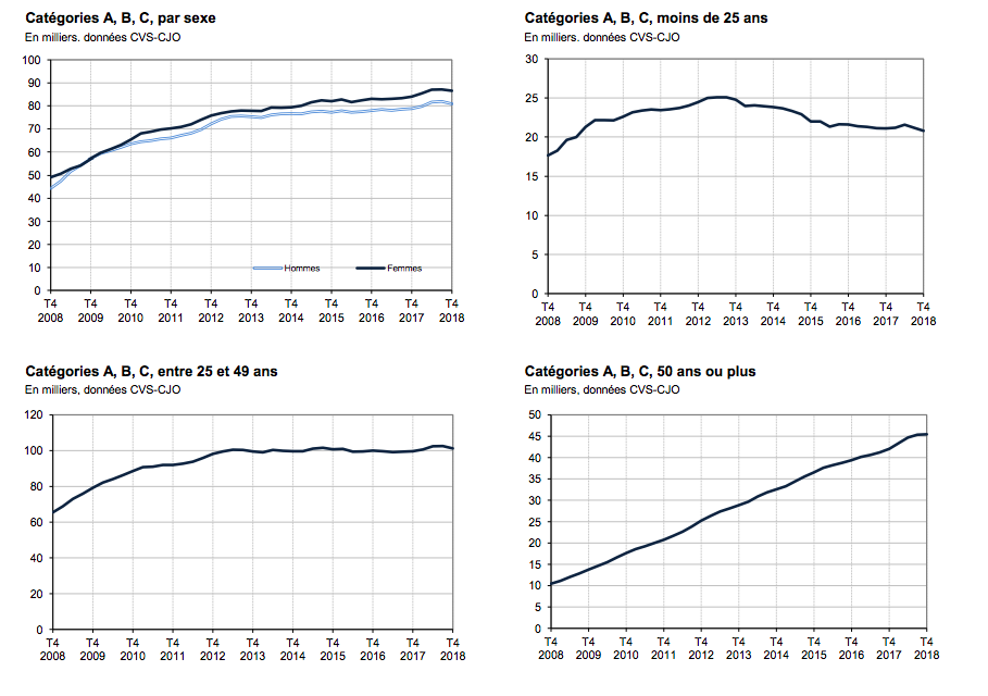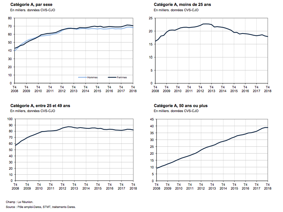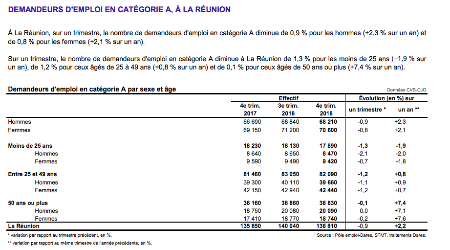 Sur les trois derniers mois de 2018, il y avait en moyenne 138 810 demandeurs d'emploi tenus de rechercher un emploi et sans activité (catégorie A). Ce nombre baisse de 0,9 % sur le trimestre (soit -1 230 personnes) et progresse de 2,2 % sur un an.