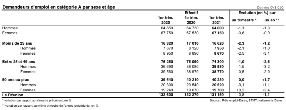 À La Réunion, sur un trimestre, le nombre de demandeurs d'emploi en catégorie A diminue de 1,1 % pour les hommes (–1,3 % sur un an) et de 0,6 % pour les femmes (–0,9 % sur un an).