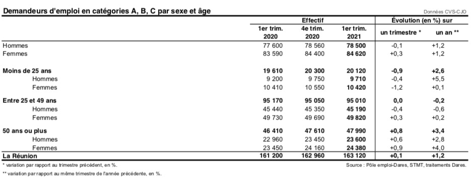 Sur un trimestre, le nombre de demandeurs d'emploi en catégories A, B, C diminue à La Réunion de 0,9 % pour les moins de 25 ans (+2,6 % sur un an), reste stable pour ceux âgés de 25 à 49 ans (–0,2 % sur un an) et progresse de 0,8 % pour ceux âgés de 50 ans ou plus (+3,4 % sur un an).