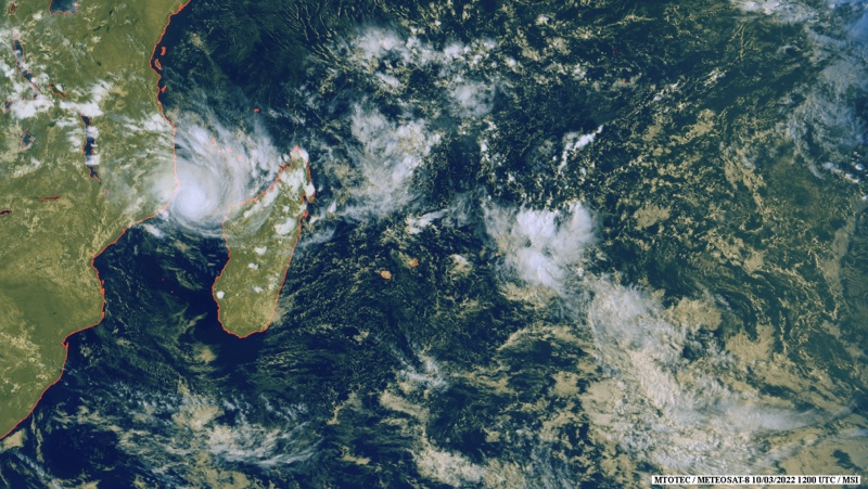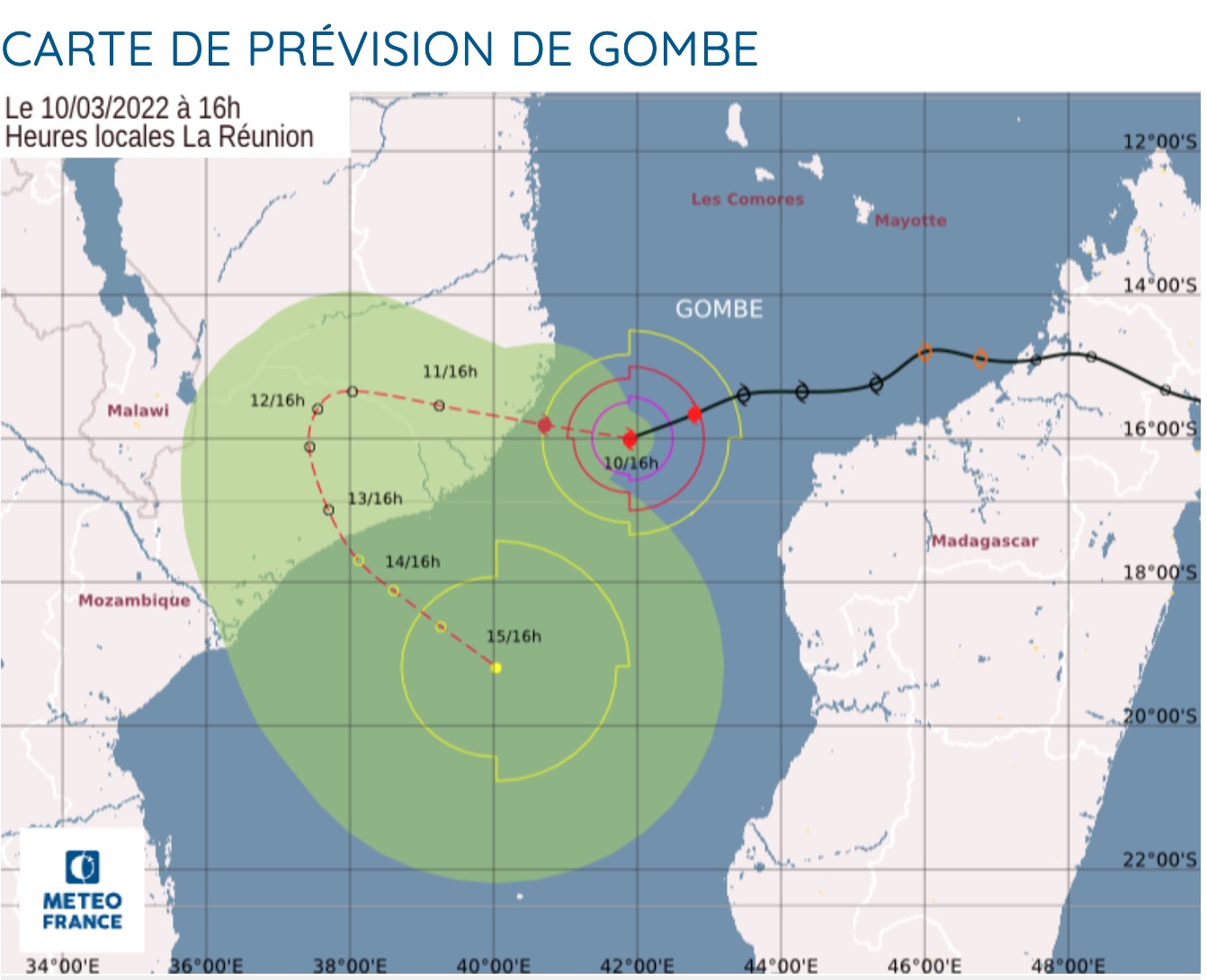 Gombe est passé au stade de cyclone ce jeudi 10 mars 2022 au matin et il continue de s'intensifier selon Météo France. Il pourrait atteindre le stade de cyclone intense dans les heures qui viennent, alors qu'il se rapproche dangereusement des côtes du Mozambique. Il présente une menace "très sérieuse" pour la province de Nampula "où il pourrait atterrir en fin de nuit prochaine, notamment sur le littoral entre Angoche et Nacala" précise Météo France. (Photo Mtotec)