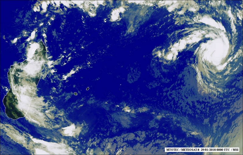 À 16 heures ce lundi 29 janvier 2018 le cyclone tropical intense Cébile se trouvait à 2735 kilomètres à l'est de La Réunion par les points 15.3 Sud et 81.2 Est. Il se déplace à la vitesse de 9 km/h le long d'une trajectoire ouest-sud-ouest. Il ne présente pas de danger pour La Réunion au cours des prochaines 72 heures. Selon les météorologues Cébile va encore plus s'éloigner de l'île et rester à bonne distance de toutes terres habitées (Photo https://www.mtotec.com)