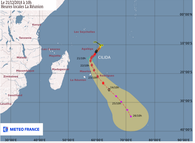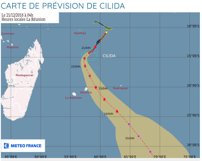 Cilida continue de se rapprocher de l'île. À 10 heures ce vendredi 21 décembre 2018 il se trouvait à 745 km au nord-nord-est de La Réunion. Il suit une trajectoire sud-sud-ouest qui le rapproche des terres réunionnaises à la vitesse de 9 km/h.