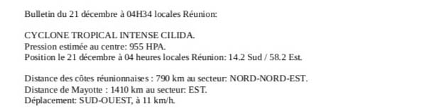 Ainsi que Météo France l'avait annoncé, Cilida s'est renforcé dans la nuit. C'est maintenant un cyclone intense. A 4 heures le météore se trouvait à à 790 km au nord-nord-est de La Réunion. Il suit une trajectoire sud-ouest qui le rapproche des terres réunionnaises à la vitesse de 11 km/h.