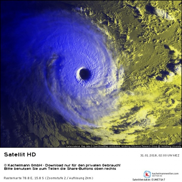 A 10 heures ce jeudi 1er février 2018 le cyclone intense Cebile se situait à 2235 km à l'est-nord-est de La Réunion par les points 15.6 sud et 76.2 est. Il et doté d'un oeil de 100 km de diamètre qui "pourrait largement engloutir l'île Maurice et La Réunion" indique Météo France. Le système se déplace vers l'ouest à la vitesse de 4 km/h. Il ne présente pas de danger pour l'île (Photo satellite publiée par L'oeil du cyclone/Twitter)