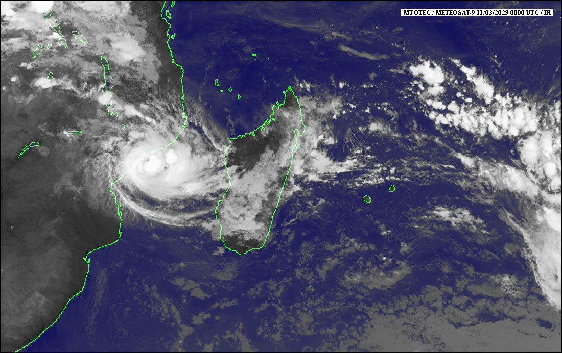 Le cyclone Freddy va de nouveau toucher terre au Mozambique soit, ce samedi soir 11 mars 2023 soit ce dimanche. A 16h30 il se trouvait à 30 km approximativement de la frange maritime de la province du Zambèze. Son déplacement très lent rend sa zone d'influence importante et son moment "d'atterrissage" précis encore incertain. Cela fait désormais 34 jours que le système a vu le jour, battant des records, et il semble refuser de se désagréger. De nombreux dégâts sont redoutés au Mozambique, qui a déjà souffert d’un premier passage fin février. Sept personnes étaient décédées, et plus de 163 000 ont été affectés par le cyclone. (Photo www.mtotec)
