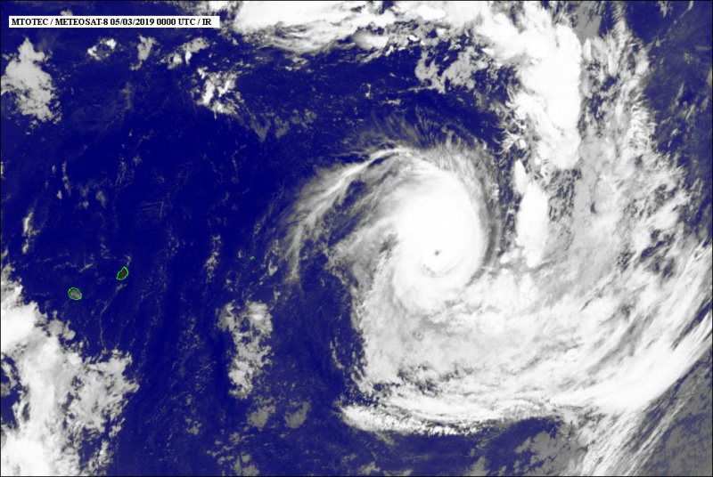 A 16h20 ce mardi 5 mars 2019 le cyclone intense Haleh se situait à 1675 km à l'est de La Réunion. Il se déplace vers le sud-ouest à 13 km/h. Les vents produits par Haleh soufflent en moyenne à 175 km/h et à 215 km/h en rafales. Le système, qui ne menace pas l'île, va commencer à baisser d'intensité mercredi. Il sera rétrogradé au stade de cyclone et à celui de forte tempête dès jeudi. Il continuera de plonger vers le sud, loin de La Réunion (Photo www.mtotec.com)
