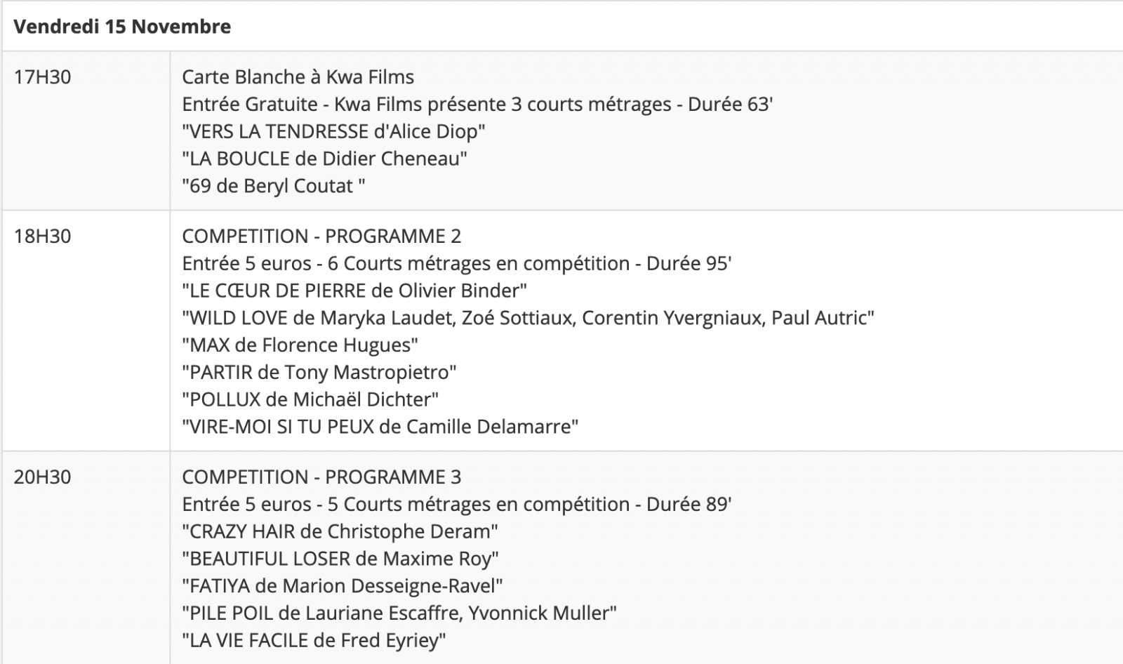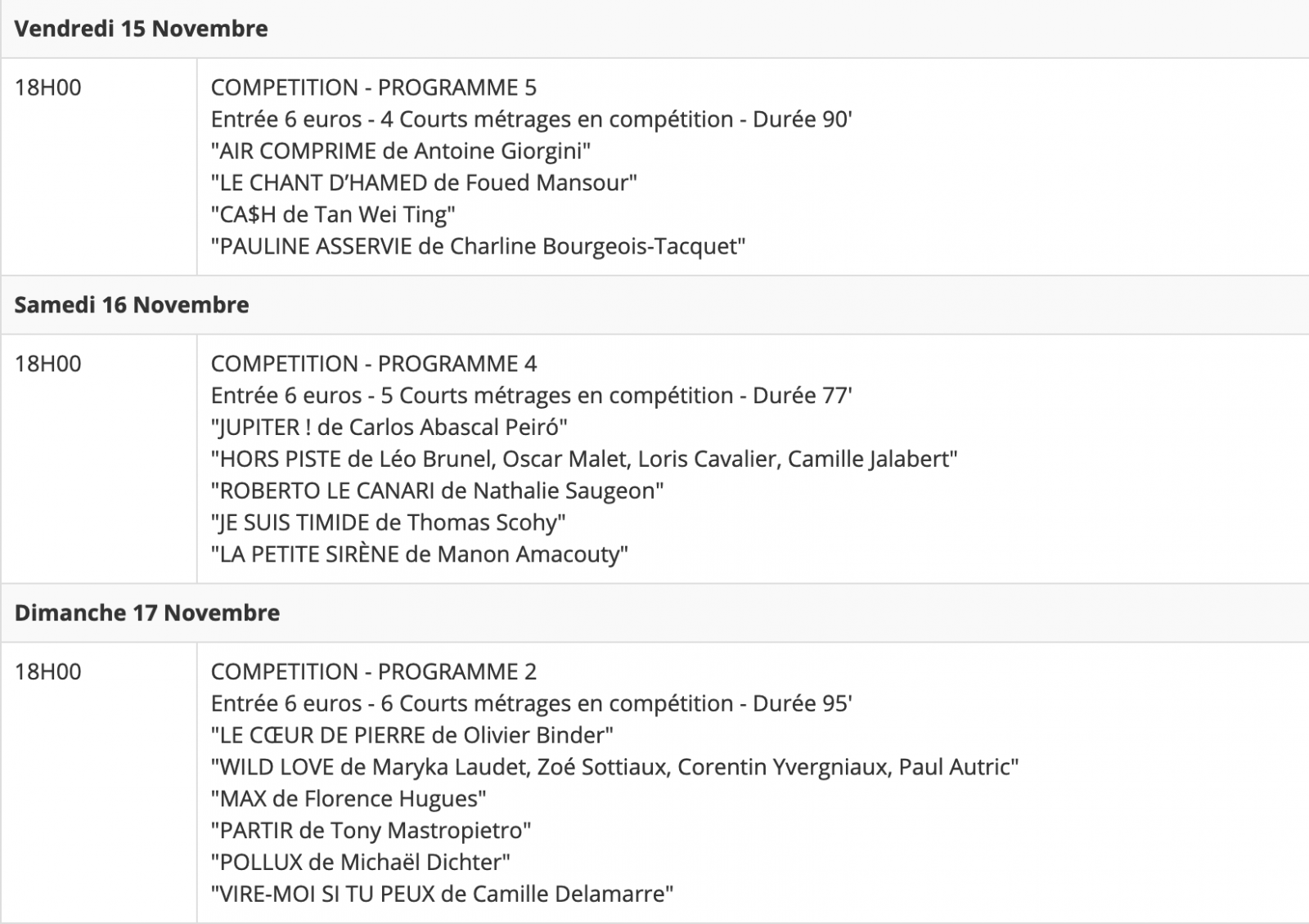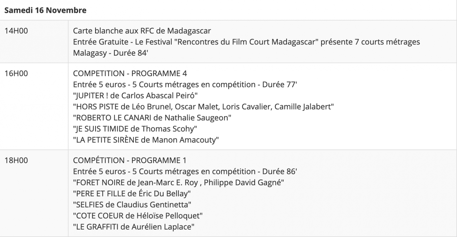 Cette année, 78 courts-métrages sont présentés et 25 courts-métrages sont en compétition. En tout, six pays sont représentés : Etats-Unis, Singapour, Suisse, Canada, Madagascar et France (métropolitaine et Réunion).