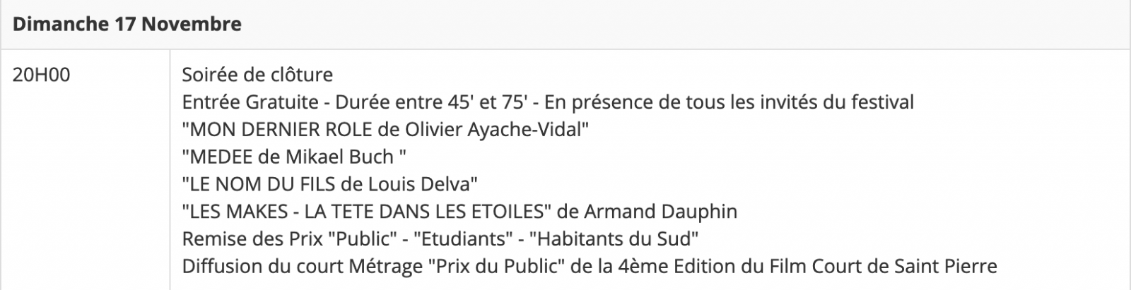 Quatre villes sont concernées par le festival : Saint-Pierre, Saint-Louis, Cilaos et Petite-Ile, qui fait son entrée ce vendredi 15 novembre. En tout, 33 séances proposées, 17 programmes, 5.000 spectateurs attendus au total, et 3 prix décernés (Public, Etudiant et Kartier).