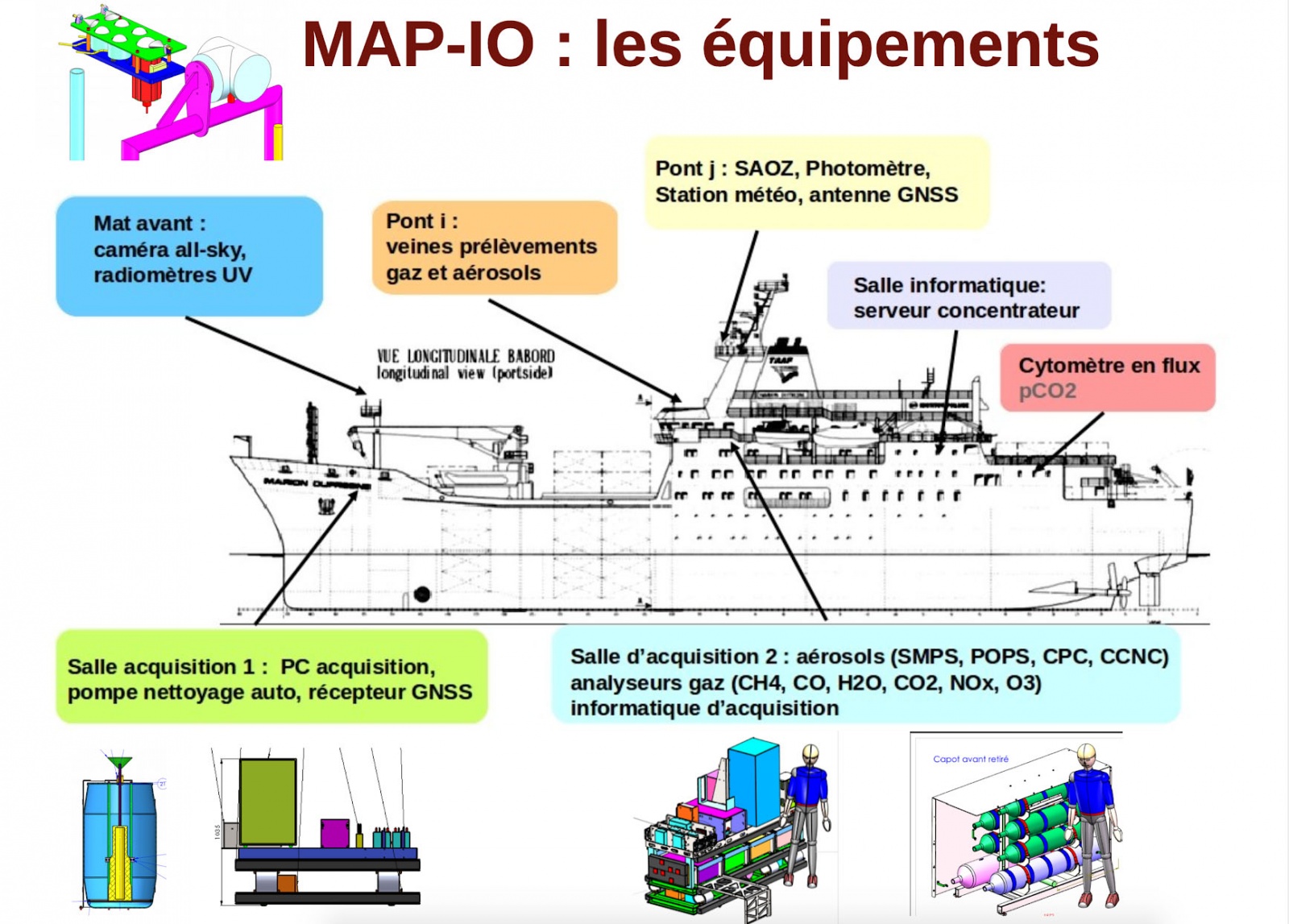 En tant que plate-forme mobile d’observation, MAP-IO est donc structuré autour de six axes principaux. A commencer par la caractérisation de l’état de surface océanique et de la composition biologique en phytoplancton ; données qui permettent de participer à la calibration des données satellites et à la validation des modèles océaniques et biologiques sur l’océan Indien et austral. Suivent la caractérisation des émissions de gaz et d’aérosols marins pour les modèles atmosphériques de prévision numérique ou de climat. L’étude des transports de masses d’air et la redistribution des aérosols et des composés chimiques dans la troposphère et la stratosphère. La surveillance des changements atmosphériques globaux en particulier dans les régions des océans Indien Sud et Austral.