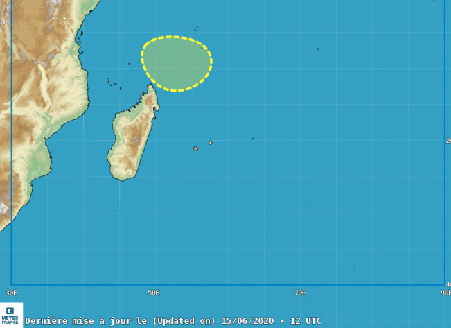 "Un système de faible intensité pourrait prendre naissance au nord-est de Madagascar pour le week-end du 20 et 21 juin 2020" indique Météo France. "Cette tendance est à confirmer au cours des prochains jours car le risque est pour le moment faible" précisent les météorologues. Ils ajoutent que le système "prenne ou pas de la vigueur, un temps dégradé pourrait concerner la région nord de Madagascar en début de week-end". Cette dégradation ne devrait pas concerner La Réunion (Capture d'écran Météo France)