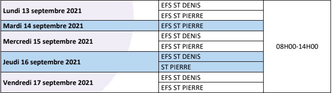 En raison d'un manque de ressources, les ouvertures des sites fixes pour le mois de septembre sont réaménagées. Retrouvez le planning des ouvertures de Saint-Denis et de Saint- Pierre du lundi 13 au samedi 17 septembre 2021.