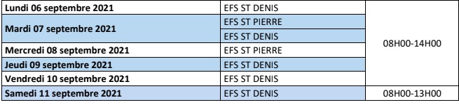 En raison d'un manque de ressources, les ouvertures des sites fixes pour le mois de septembre sont réaménagées. Retrouvez le planning des ouvertures de Saint-Denis et de Saintt- Pierre du lundi 6 au samedi 11 septembre 2021.