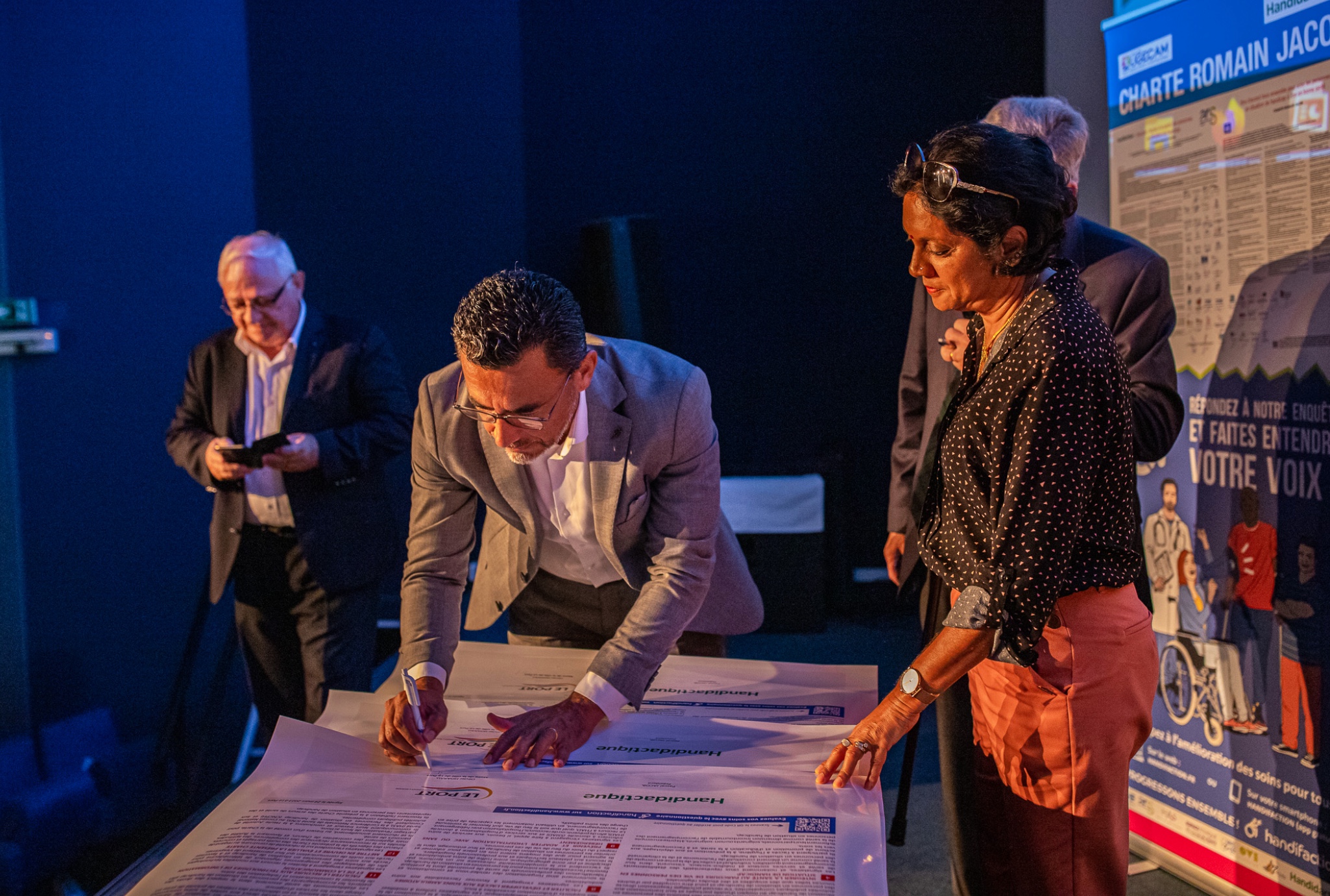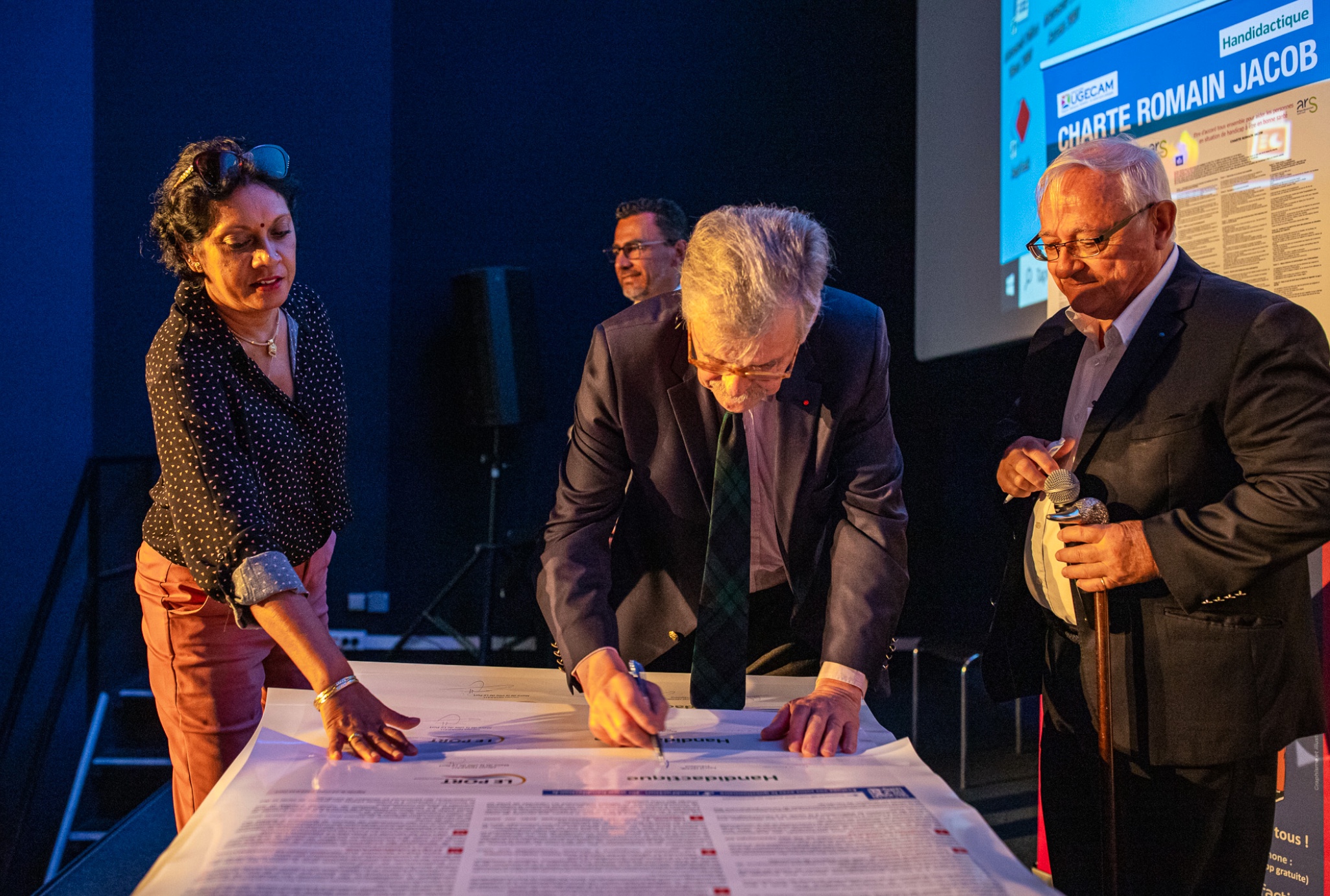 Signature ce vendredi 24 mars de la charte Romain Jacob par le maire du Port, Olivier Hoarau, et le président de Handidactique, Pascal Jacob, en présence de l’élue Karine Mounien. Cette signature intervient dans le cadre de la journée sur les handicaps sensoriels au cinéma Casino du Port.