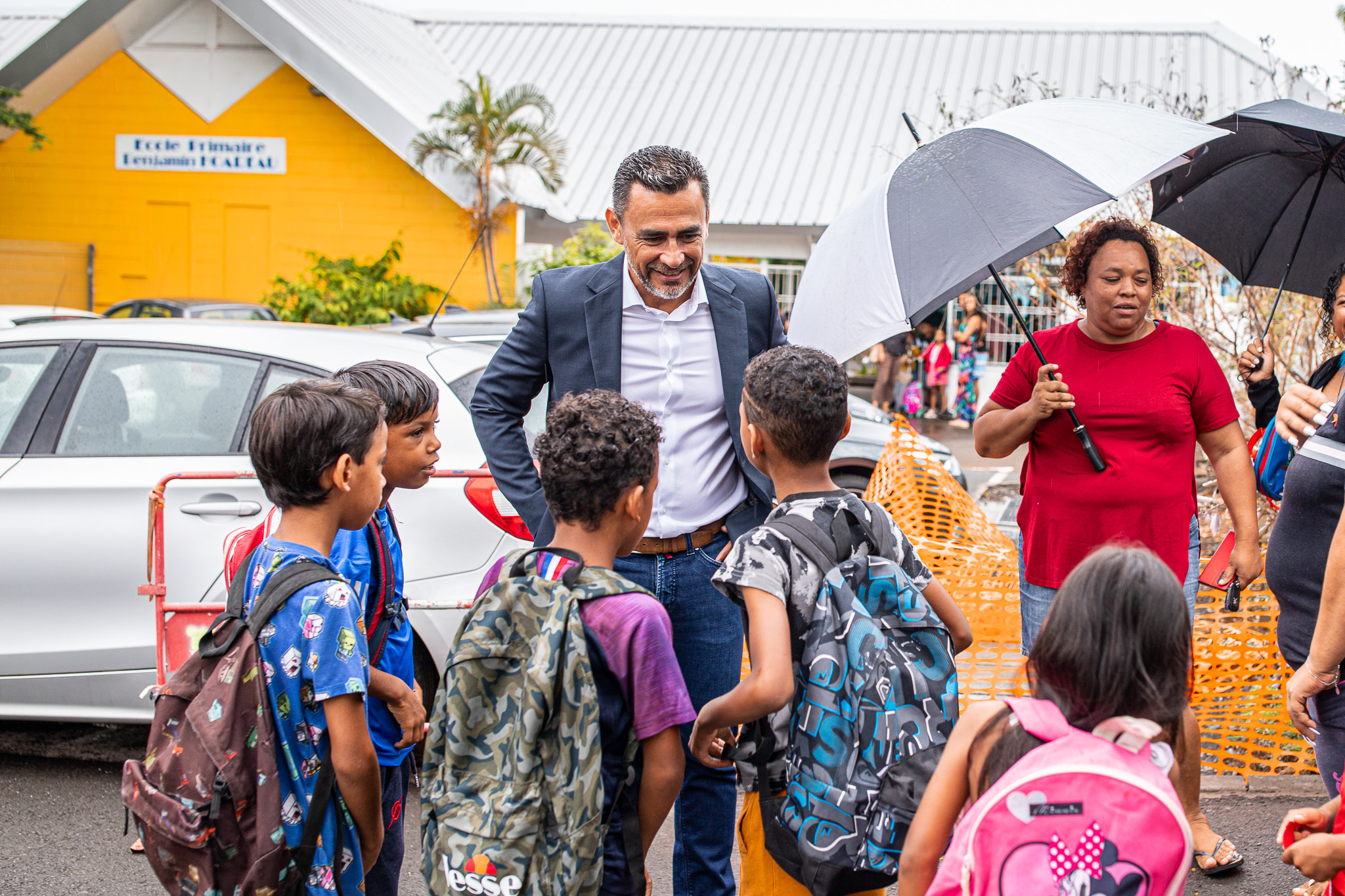 Le maire Olivier Hoarau accompagné des élus du Conseil municipal du Port et en présence de l’inspecteur de l’Éducation nationale, Paul Burkic a accueilli ce lundi 23 janvier 2023 enfants, parents et personnel au groupe scolaire Benjamin Hoareau. Situé en REP +, il accueille 169 élèves et une classe ULIS malvoyants et malentendants. Pour le maire, c’était l’occasion de souhaiter une bonne rentrée et une bonne année aux enfants et d’évoquer les aménagements réalisés et projets en cours. Olivier Hoarau rappelle également la mise en place de la cantine gratuite : « on a une augmentation du nombre d’enfants qui mangent à la cantine, c’est une très bonne nouvelle. Le choix que nous avons fait de permettre aux parents de laisser les enfants à la cantine et d’avoir l’assurance d’un repas équilibré est payant. Ils font confiance à l’école et à la restauration scolaire parce que mangé lé bon. » Voici le communiqué de la commune. (Photo : Le Port)