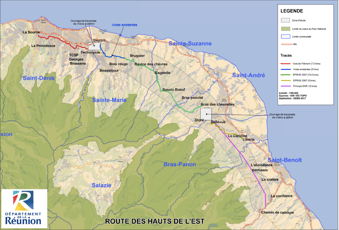 La future route reliera la Technopole à Saint-Benoît sur près de 40 kilomètres, et se trouvera entre 200 et 400 mètres d'altitude. Elle concernera les communes Saint-Denis, Sainte-Marie, Sainte-Suzanne, Saint-André, Bras-Panon, Saint-Benoît. Même si Salazie ne sera pas directement concernée, la commune sera néanmoins associée au processus de réflexion.