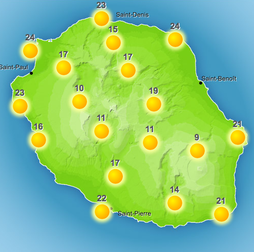 En montagne le temps est ensoleillé en matinée, même si quelques nuages viennent buter sur le flanc Est du volcan. L'après-midi s'annonce plus nuageuse que la veille. Cilaos et Mafate conservent malgré tout quelques éclaircies. Les plus hauts sommets gardent la tête au soleil.