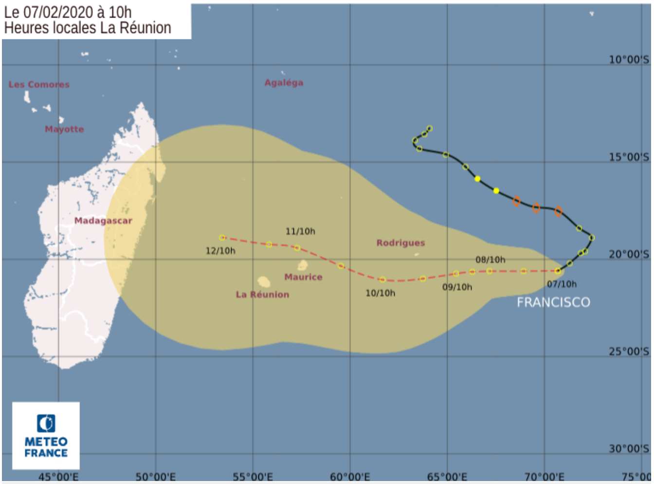 Ce vendredi 7 février 2020, Météo France refait un point sur le système Francisco, maintenant qualifié de "perturbation" et non plus de tempête. Le système est encore très loin des côtes réunionnaises, 1540 km à l'Est. Mais il a marqué un virage notable, se rapprochant de fait de La Réunion et de Maurice. Selon les prévisions de Météo France et Mtotec, le système revient vers l'ouest. Il se déplace à une vitesse à 11 km/h. (Photo Mtotec)