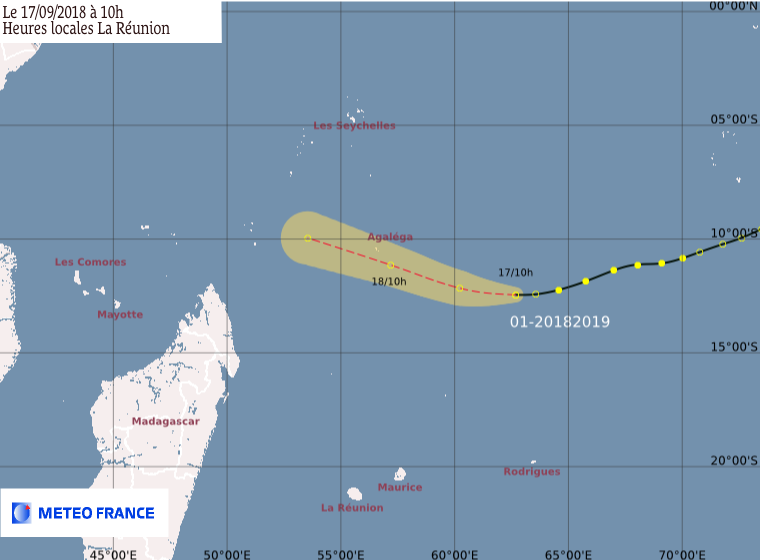 La première perturbation de la saison poursuit sa route loin des terres habitées. A 10 heures ce lundi 17 septembre 2018, elle se situait à 1200km au Nord-Est de La Réunion. Elle se déplace vers l'Ouest à une vitesse de 17km/h. Le système étant en voie de comblement, il ne devrait pas se réintensifier indique Météo France dans son dernier bulletin.