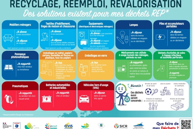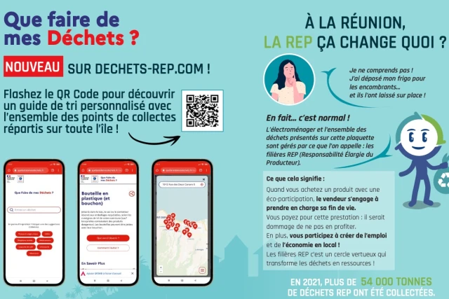 Ce visuel invite également les Réunionnais à utiliser une application et un site internet (www.dechets-rep.com) qui lui permettra de géolocaliser les points de collecte de ces différents déchets.