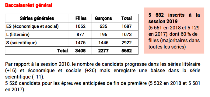 Par rapport à la session 2018, le nombre de candidats progresse dans les séries littéraire (+16) et économique et sociale (+26) mais enregistre une baisse dans la série scientifique (- 11).
