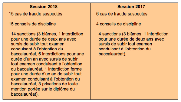 Tous les candidats sont informés des consignes à respecter et des sanctions encourues grâce à une notice d’information affichée sur la porte de chaque salle d’examen et lue lors de la première épreuve écrite de la session.