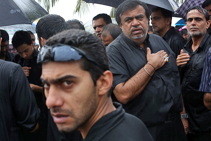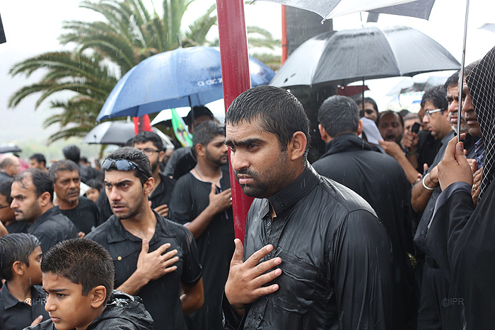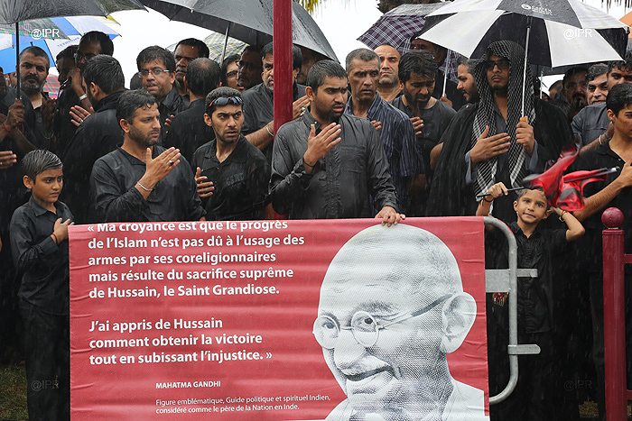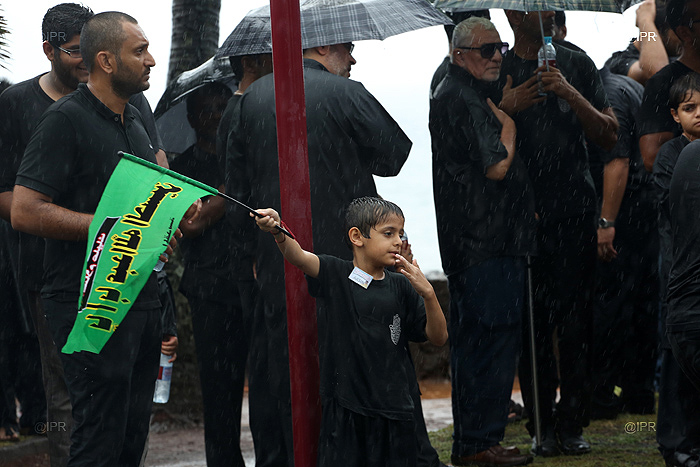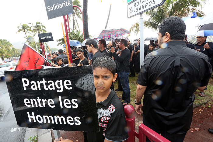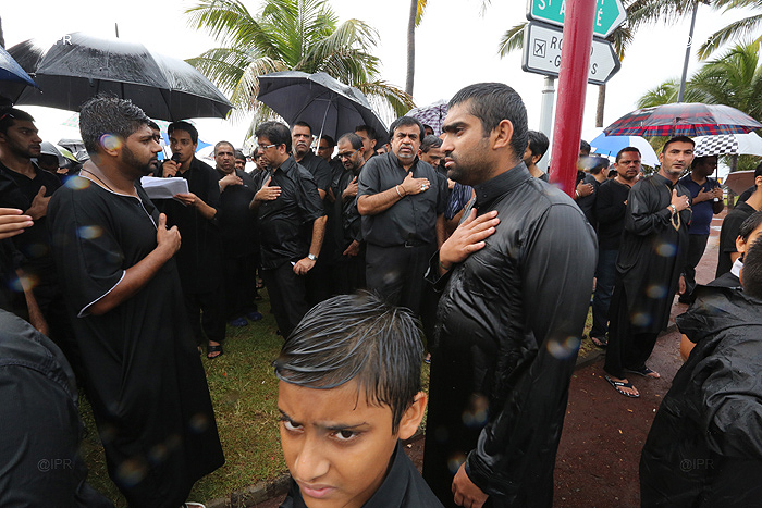 Dans le cadre de la célébration de l'Achoura, des Musulmans chiites, - l'une des deux principales branches de l'islam -, ont défilé ce jeudi 14 novembre 2013 après-midi, sous la pluie, à Saint-Denis le long du Barachois. Vêtus de noir, en signe de deuil, ils ont commémoré l'assassinat de l'imam Hussein, petit-fils du prophète Mohamed, et de 71 de ses proches en l'an 680 à Kerbela en Irak.