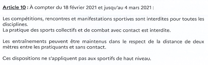 Concernant l'article 10, voici "ce qu'il faut entendre de manière plus détaillée" : "sont interdites dans l'ensemble des disciplines sportives, sauf pour les sportifs inscrits dans les projets de performance fédéraux, les compétitions sportives, rencontres et toutes autres formes de manifestations. NB : toujours huis-clos et sans buvette". Concrètement, en suivant toujours leur logique, les articles 8.D et 10...sont les mêmes.