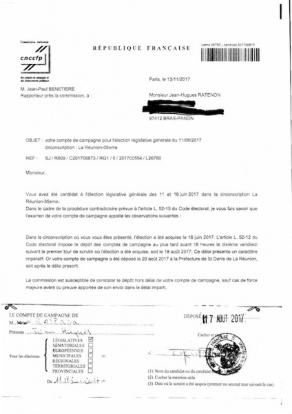 "Votre compte de campagne a été déposé le 20 août 2017 à la préfecture de Saint-Denis de La Réunion, soit après le délai prescrit", indiquait le courrier de la CNCCFP. Un élément contredit par le mandataire de Jean-Hugues Ratenon depuis quatre campagnes électorales où les comptes ont toujours été transmis à temps.