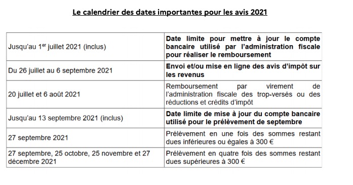 • vous avez un montant à payer si le montant prélevé en 2020 n’a pas permis de couvrir l’intégralité de votre impôt ou si vous avez bénéficié d’une avance de réductions ou crédits d’impôt trop importante en janvier 2021. Dans ce cas, le montant à payer sera directement prélevé sur votre compte bancaire à partir du 27 septembre 2021, en une fois s’il est inférieur ou égal à 300€, ou en quatre fois s’il est supérieur à 300 €. Pour garantir le déroulement rapide et sécurisé de ces opérations, assurez-vous sans tarder (et en tout état de cause avant le 1er juillet) que le compte bancaire connu de l’administration