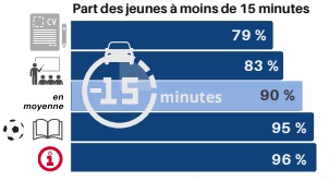 Les jeunes sont les plus éloignés des équipements favorisant l’emploi et l’insertion (11 minutes en moyenne), 21 % des jeunes étant situés en moyenne à au moins 15 minutes.