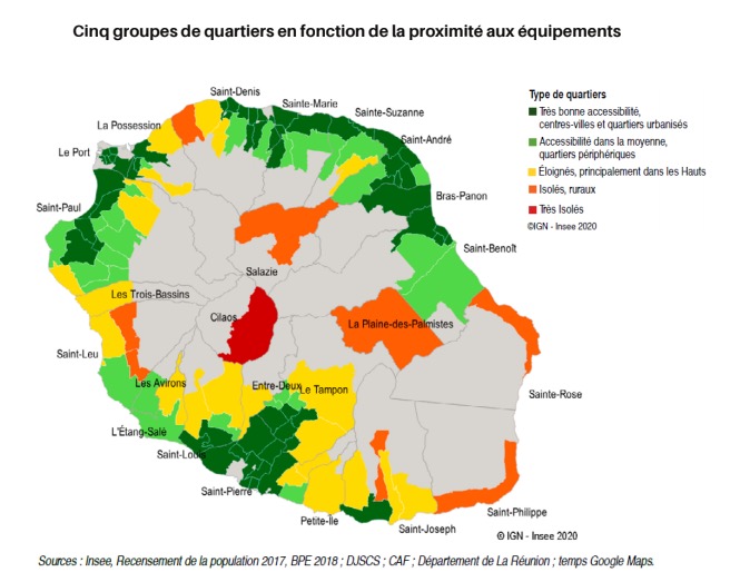 Les 114 grands quartiers de La Réunion ont été regroupés selon le temps d’accès des jeunes aux différentes catégories d’équipements pour former cinq groupes homogènes de quartiers.