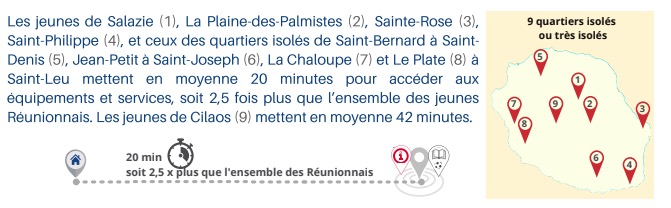À l’opposé des jeunes des quartiers de centre-ville, 8 800 jeunes vivent dans neuf grands quartiers "isolés ou très isolés", en lien avec la configuration montagneuse ou sauvage de La Réunion et son réseau routier contraint. Les jeunes de ces territoires cumulent précarité sociale et éloignement aux équipements qui pourraient favoriser leur insertion.