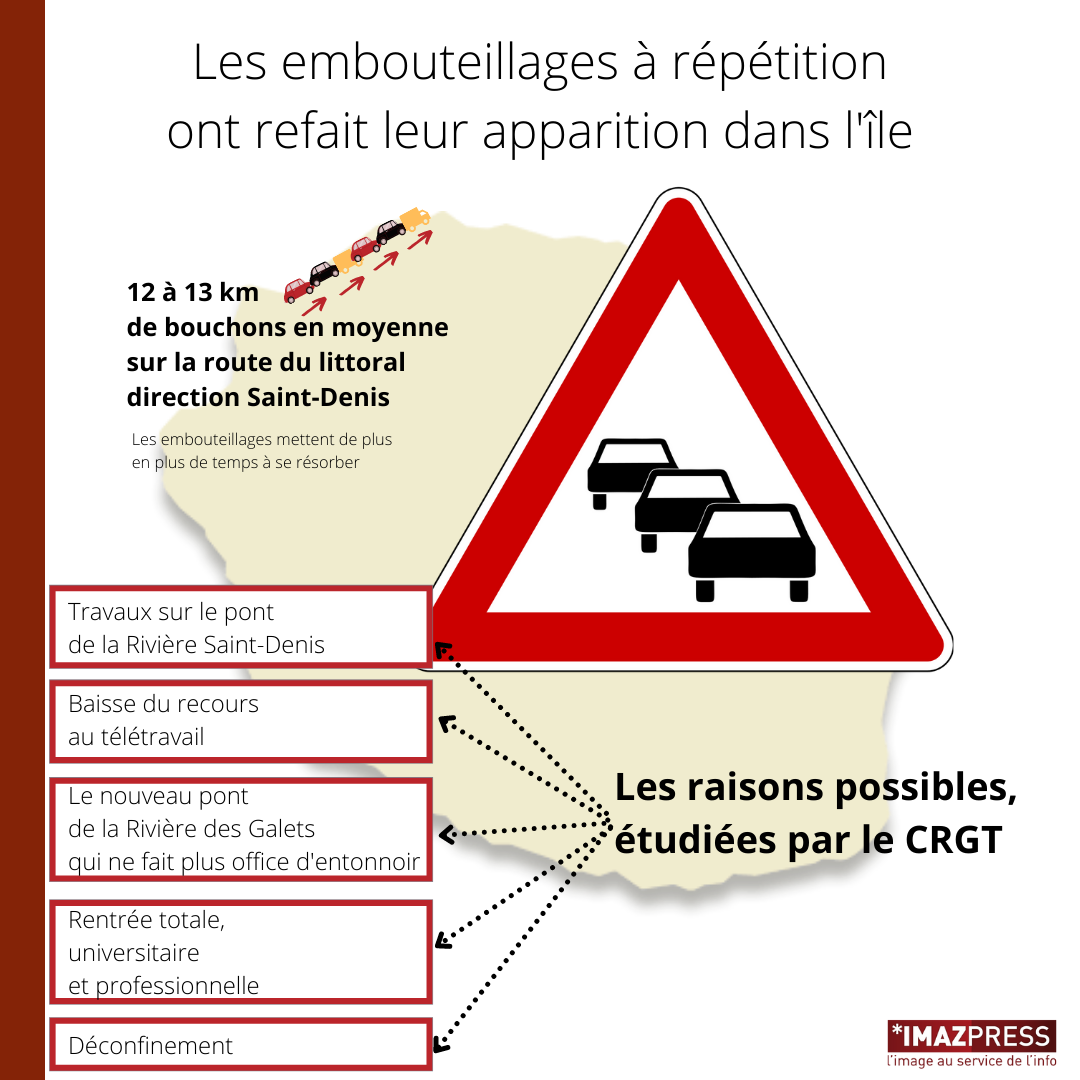Les embouteillages sont choses courantes à La Réunion, tout le monde le sait. Mais après un an et demi de télétravail et de cours en distanciel, l'afflux de voiture semble s'être envolé en l'espace de quelques jours. "Quand il y a des accidents cela peut s'expliquer facilement, par exemple jeudi 9 septembre nous avions la voie de droite neutralisée sur la Route du littoral. Il y a eu aussi un carambolage à l'entrée Est de Saint-Denis le même jour. Mais l'afflux de voitures est beaucoup plus important" souligne le CRGT.