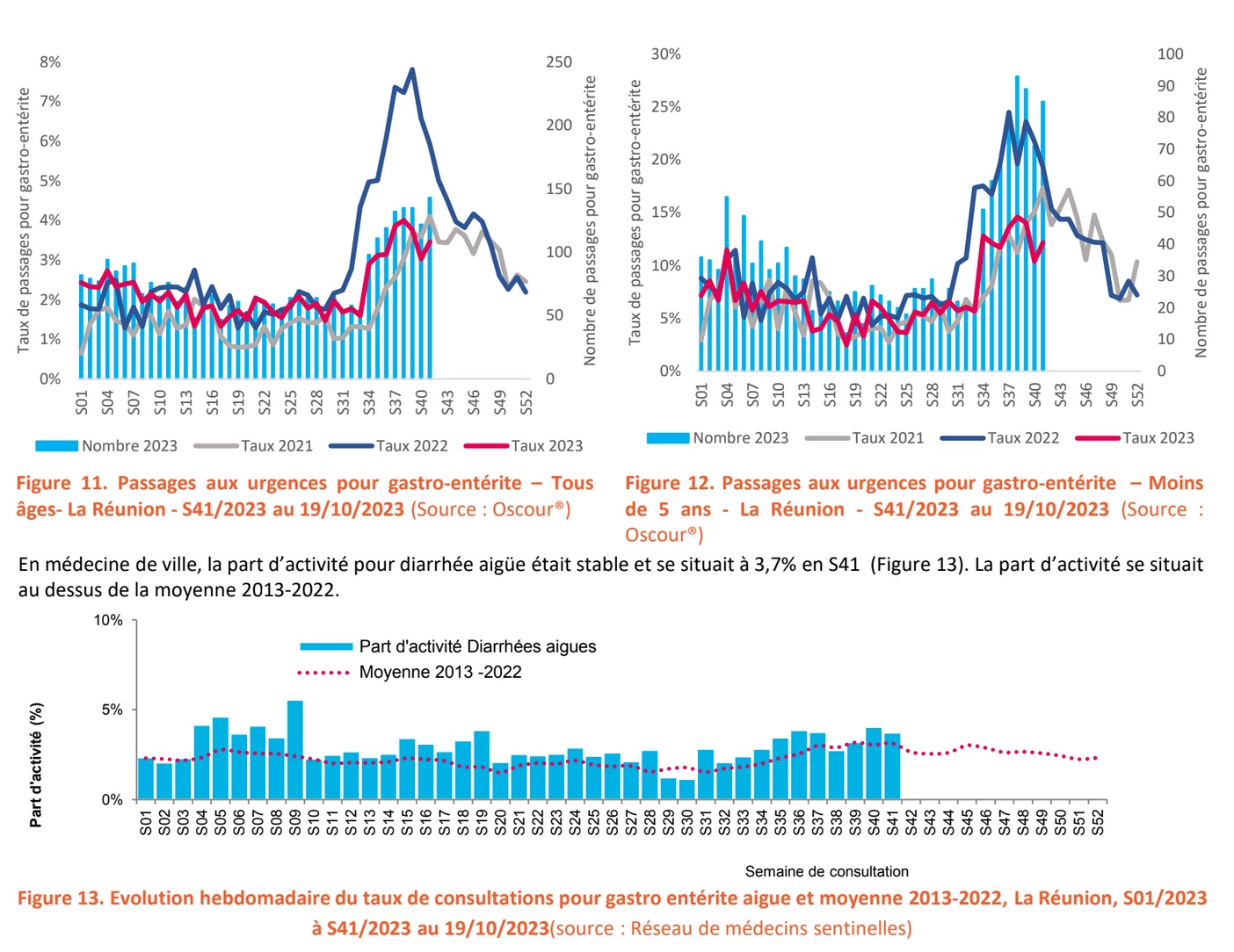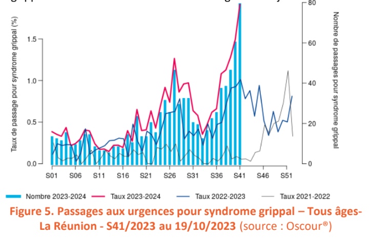 La double épidémie de grippe et de gastro-entérite continue à La Réunion. En semaine 41, les passages aux urgences sont en hausse concernant la grippe et la gastro. Le nombre de passages aux urgences pour un syndrome grippal a augmenté de 32% en une semaine. La hausse des indicateurs sanitaires se poursuit pour la bronchiolite chez les moins de deux ans sans pour autant noter de contexte d’épidémie.