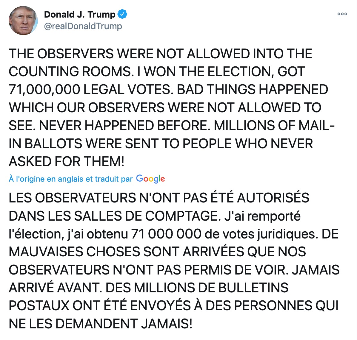Il affirme : "j'ai gagné l'élection avec 71 millions de votes légaux", et pour lui "des choses louches se sont passées, que les observateurs républicains n'ont pas été autorisés à voir". Il maintient donc que le scrutin a été la cible d'une fraude électorale.