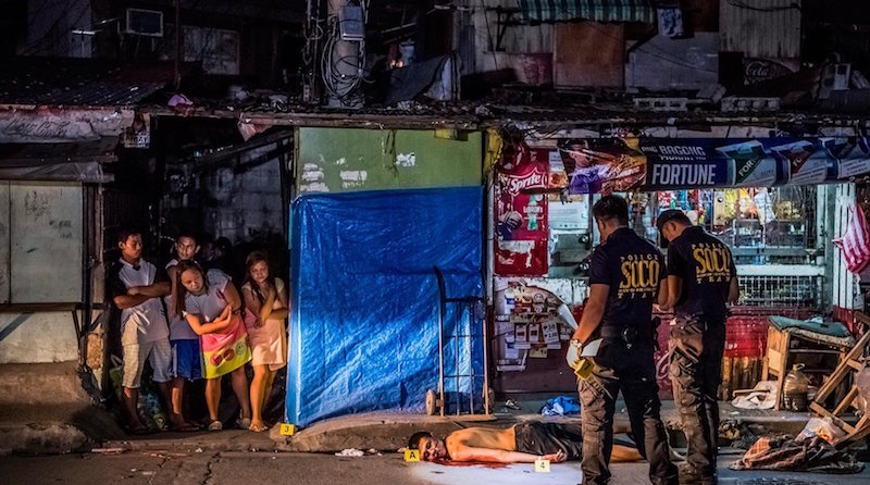 "Ils nous abattent comme des animaux" de Daniel Berehulak. Cette photographie prise à Manille, aux Philippines, par Damien Berehulak montre une scène presque courante dans le pays. Il raconte qu'au cours des 35 jours qu'il a passé sur place, il a photographié 57 victimes de meurtres dans 41 lieux. "J’ai été témoin de scènes sanglantes presque partout", déclare-t-il. Ces drames sont intervenus dans le cadre de la campagne contre la drogue lancée par le président Rodrigo Duterte dès son arrivée au pouvoir le 30 juin 2016. 3 000 personnes ont été tuées par la police depuis cette date.