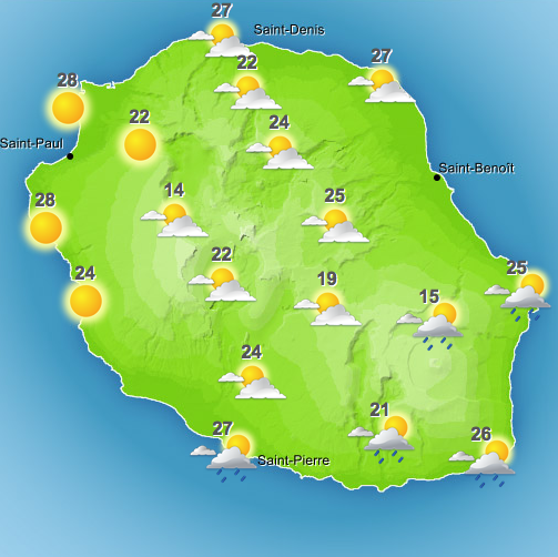Au cours de l'après midi, le ciel s'assombrit rapidement sur le relief. Des averses sont attendues du côté du Maido ou de la Plaine d'Affouches. Des précipitations sont à nouveau possibles sur le Sud et l'Est du département associés à une activité orageuse.