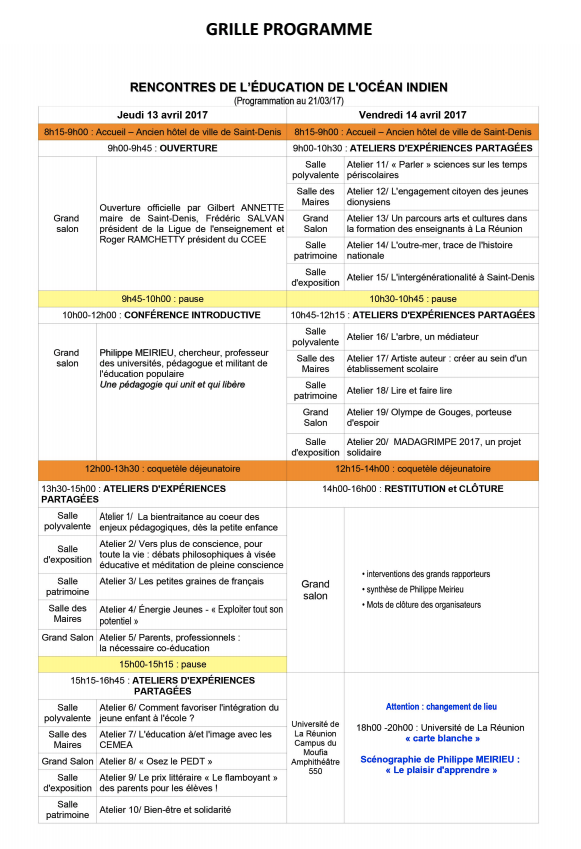 Autre moment fort de ces Rencontres : la soirée animée par P. MEIRIEU, une " carte blanche " autour du thème : " le plaisir d'apprendre " proposée le 14 avril à 18h à l’amphithéâtre 550 de l’Université de La Réunion, Campus du Moufia.