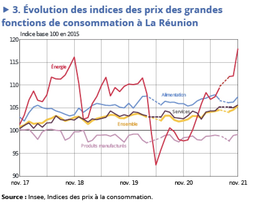 Les prix à la consommation des ménages augmentent de 0,9 % en novembre 2021 à La Réunion. Les tarifs de l’énergie augmentent nettement, accompagnés dans une moindre mesure par ceux des services, de l’alimentation – en particulier ceux des produits frais – et des produits manufacturés. Les prix du tabac sont stables. Sur un an, les prix augmentent de 3,2 % à La Réunion et de 2,8 % en France, hors Mayotte.
